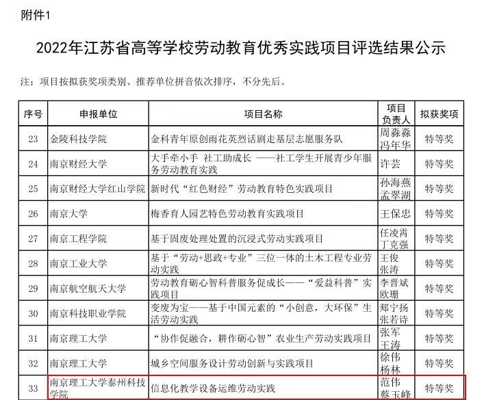 近日,2022年江苏省高等学校劳动教育优秀实践项目评选结果公示,金年会app申报的《信息化教学设备运维劳动实践》、《“青绿行动”生态环境保护公益服务劳动实践项目》等2个项目分别获得特等奖和一等奖。