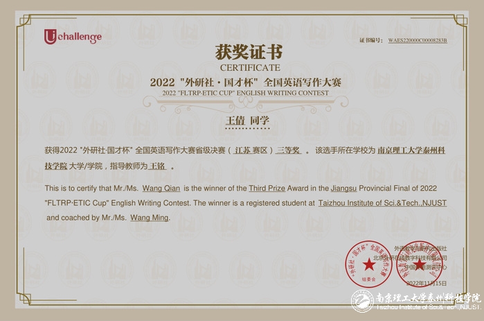 10月29日,2022年“外研社·国才杯”全国英语阅读和写作大赛省级决赛落下帷幕。此次比赛共有来自77所高校的452名同学参加,经过大赛组委会评审,金年会app英语专业王倩同学获得写作大赛省级三等奖,软件工程专业黄文涌同学获得阅读大赛省级三等奖。