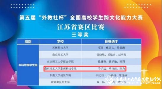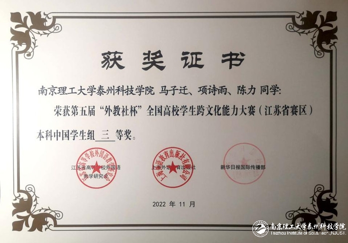 11月19日,第五届“外教社杯”全国高校跨文化能力大赛(江苏赛区)复赛在南京落幕。本届大赛由江苏省高等教育学会指导,江苏省高等学校外国语教学研究会、上海外语教育出版社、新华日报国际传播部共同主办。大赛以“坚定文化自信,增进国际理解”为主题,经校级遴选,江苏省内近50所高校,共53支团队提交了参赛视频。金年会app马子迁、项诗雨、陈力三位同学组成参赛队伍,在此次比赛中荣获省级三等奖。